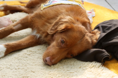 Hinterläufen. Seit ca. 3 Wochen schläft Ella nun auch wieder auf dem Rücken. In den letzten Tagen ist es wieder wärmer geworden und wir nutzen die Tage für erneute Schwimm-Einheiten. Nach dem Schwimmen läuft Ella viel besser. Sie schlänkert die Hinderbeine nicht mehr so aus, sondern hebt sie bewußter hoch und läuft damit gerader! Ich lasse sie auch öfter wieder apportieren - es macht ihr super viel Spaß. Letzte Woche habe ich in der Hundeschule einen Longierkurs gestartet. Ich denke das regelmäßige und konzentrierte Laufen wird ihr gut tun. |