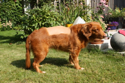 Ellas Fortschritte sind kleiner und fallen mir nicht mehr so ins Auge. Bei meinen Trainings darf sie immer wieder auch mal apportieren und hat große Freude dabei. Am Freitag bekamen wir das Ergebnis einer Routine-Blutuntersuchung: Ella hat eine Schilddrüsen-Unterfunktion! Sie bekommt ab sofort entsprechende Medikamente. Ich habe die Hoffnung, dass damit ihr Fell besser wächst, sie leichter abnehmen und sie nicht mehr soviel schlafen wird! |