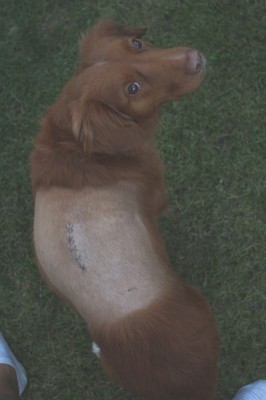 | Fr 29.8.14 | Nachmittags dürfen wir Ella besuchen. Wir finden sie liegend vor. Der Rücken ist geschoren und die Narbe ist ca. 5 cm groß. Viel bewegen kann sie sich nicht, aber sie freut sich, als sie uns sieht, ist aber noch sehr mitgenommen. | ||||||